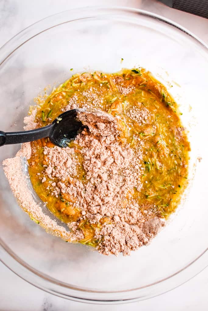 4. Add the zucchini mixture into the flour mixture and stir with a sturdy spoon to combine.