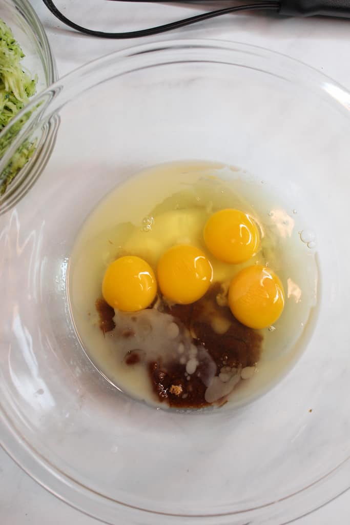 3. In a medium bowl, combine the zucchini, eggs, coconut sugar and melted butter. Mix until fully combined.