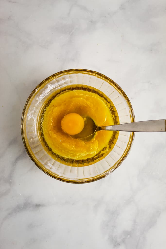 - In a small bowl, mix together the applesauce, vegetable oil, egg and vinegar.